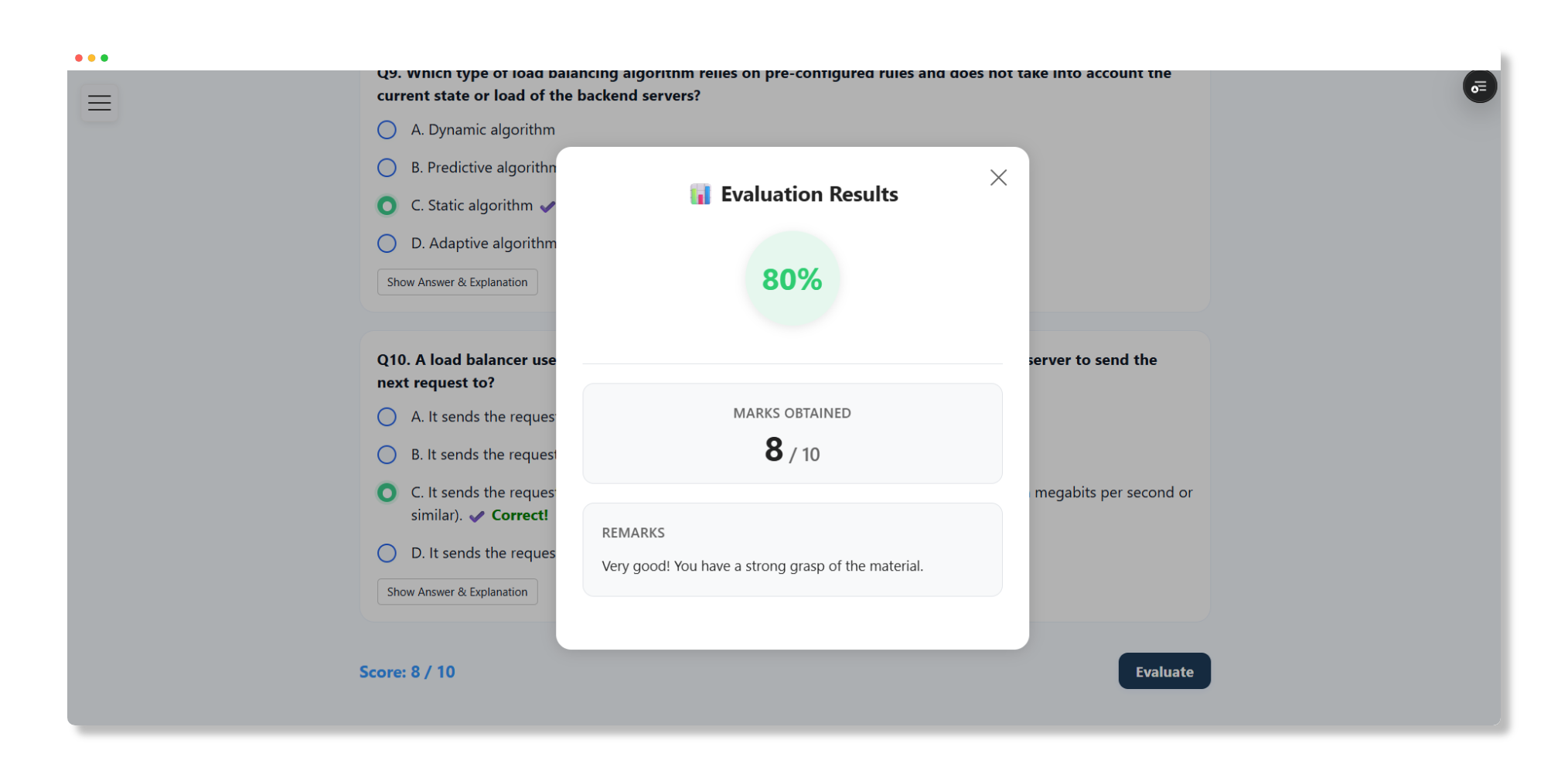 Optional succinct explanations help learners understand why an answer is correct.
